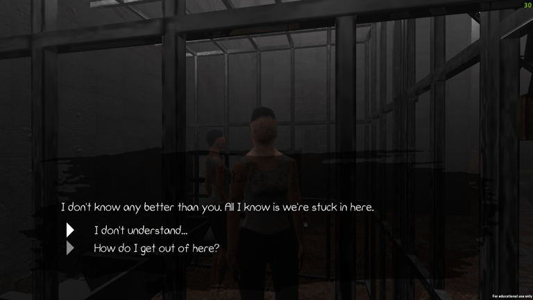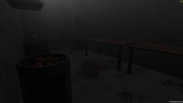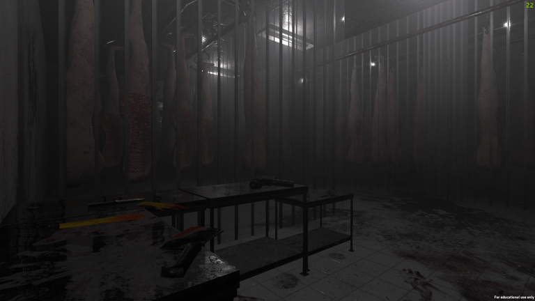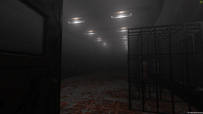 The experience is an atmospheric horror game where the player must explore a facility where humans are caged cattle. The humans go through the pains and cruelties that cows experience on a daily basis. This was done to help users better understand the topic and to make them empathize with cows.