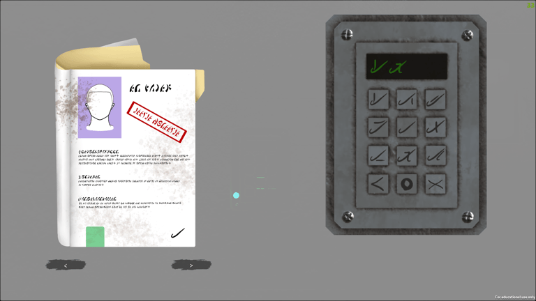 Level Design, Puzzle Design: Working with the artists, we designed the layout for the entire level, including rooms, flow of the game, and tying the level design with the puzzle design. I worked on the puzzle design for the keypad and folder.