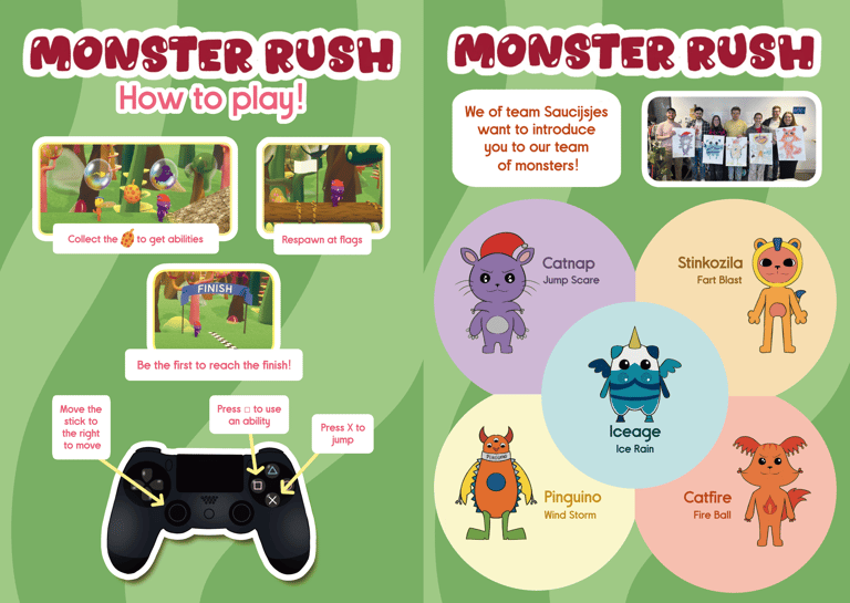 Monster Rush is a 2.5D local multiplayer (2-4 players) side-scroller where players must race against each other, use their monster's ability to get ahead of others, gain the most points and reach the finish line.
