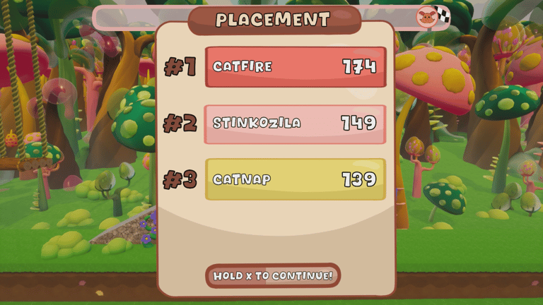 Music Production and Sound Design: I created 3 tracks for the game: one for the menu screen music, one for during the race, and one final one for the podium after all races are finished. I also did most of the sound design, taking CC0 sounds and editing them in Ableton Live, and we recorded voice lines for the monsters with each member of the team, which I then edited and implemented in the game.