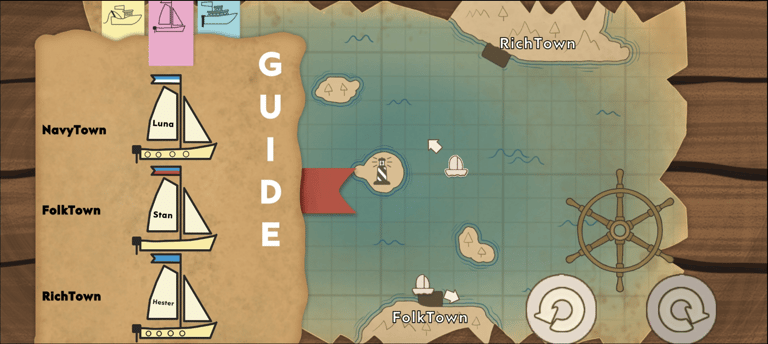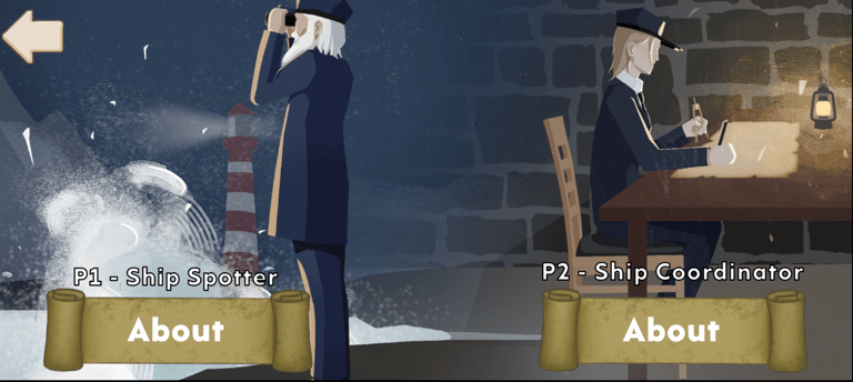 Player 1 (ship spotter): Player 1 sits atop the lighthouse, from where they can spot traversing ships by moving their phone around like binoculars. Each ship will have its own identity which depends on the ship type, its name, and the colors of its flag. The spotter must communicate the identity of the ship to the ship coordinator and let them know where they are headed, especially when obstacles are in the way.